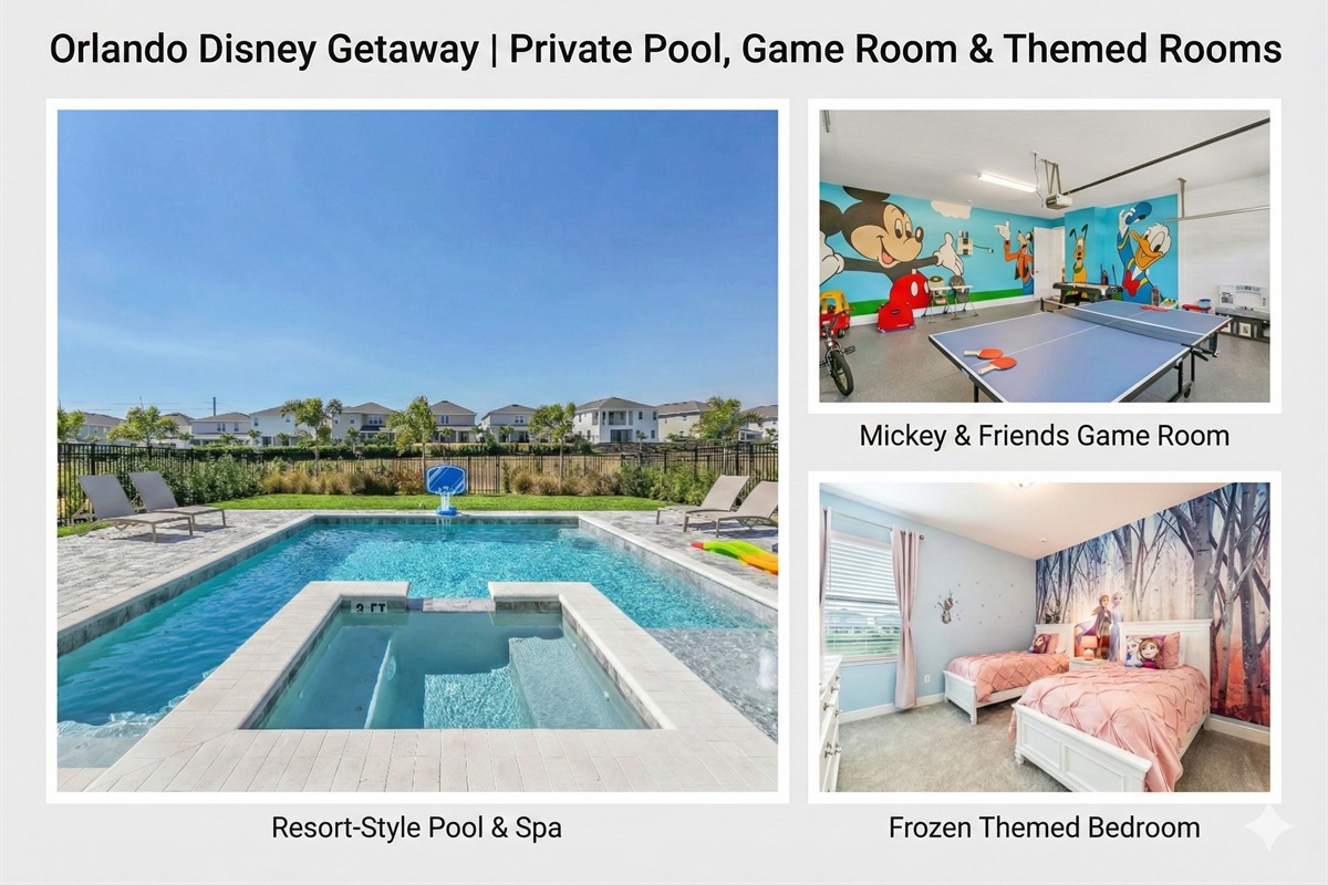 Your spacious Florida getaway awaits—just 12 minutes from Walt Disney World! Perfect for family reunions and large groups, this beautifully designed 8-bedroom, 6-bath villa welcomes up to 16 guests. With a private pool and spa, fire pit, game room, home theater, and themed kids’ bedrooms, this home delivers comfort, fun, and unforgettable memories.